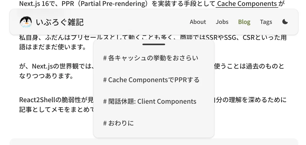 記事詳細ページの目次のデザインとしては「サイドに配置」がよくあるパターンかな?と思っています。Zennとかそうなってますよね。