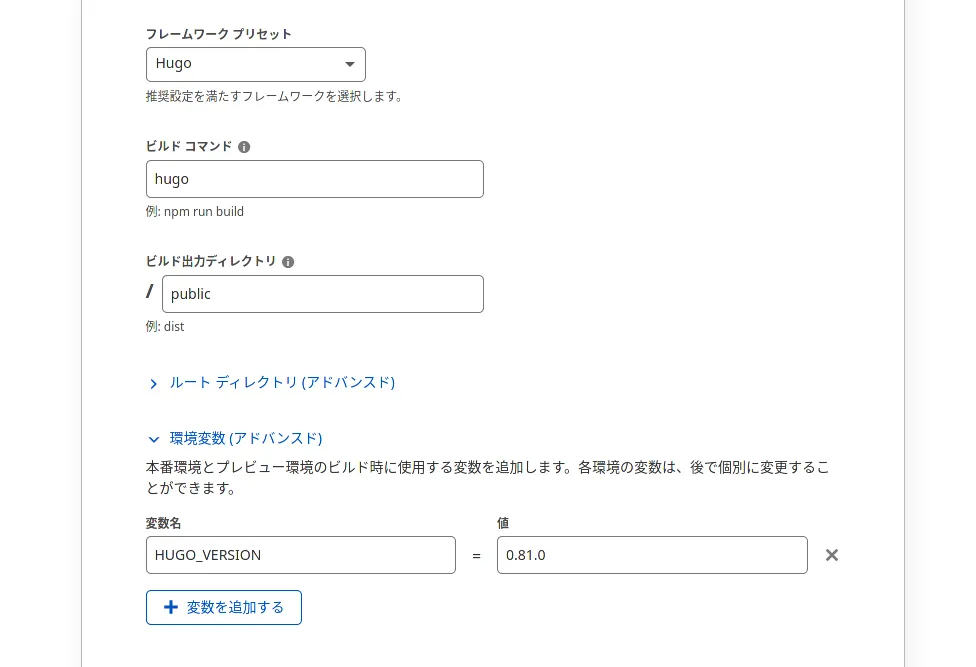 環境変数の HUGO_VERSION だけは必ず指定しましょう。これを指定しないと古いバージョンのHugoが使われ、ビルドに失敗します(失敗しました)。