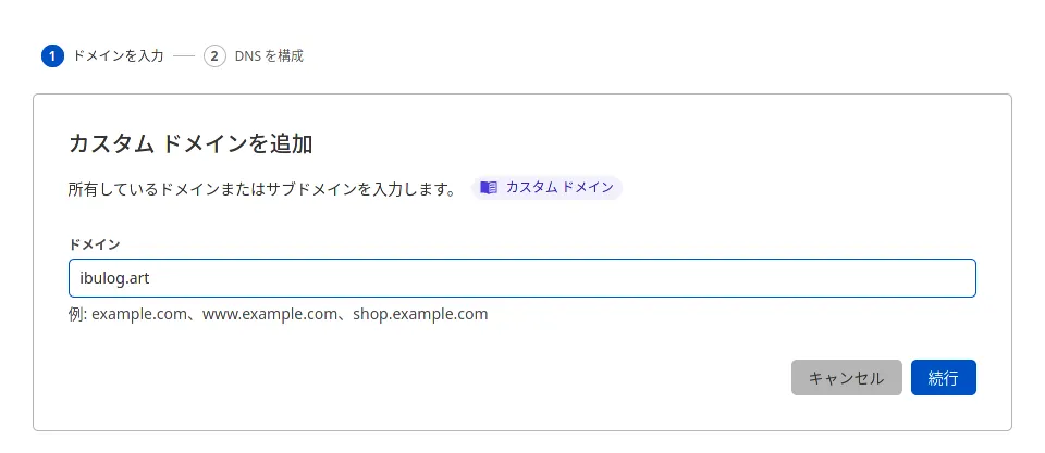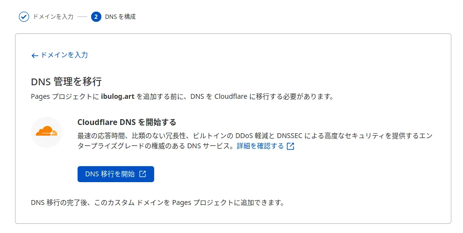 取得しておいた「ibulog.art」ドメインを、Cloudflare Pagesのカスタムドメインに設定していきます。