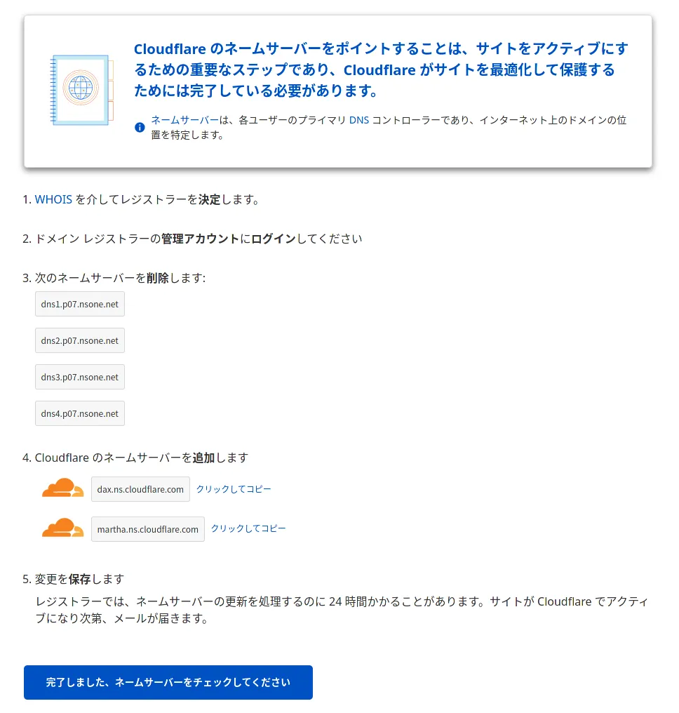 ドメインのレジストラ側でCloudflareのネームサーバーを指定しなさい、ということなので、おとなしく指定。案内された下記のネームサーバーを設定します。