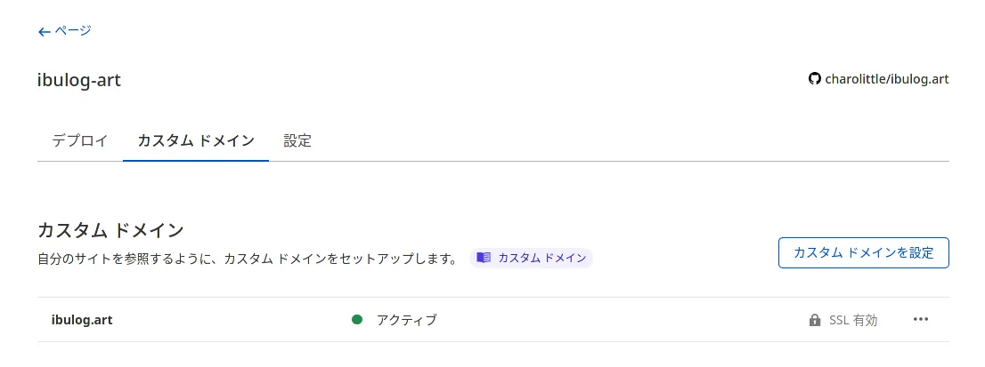 デプロイそのものは完了しましたが、HugoのbaseURLに「ibulog.art」を指定しているので、カスタムドメインを設定しないとページがうまく表示されません。