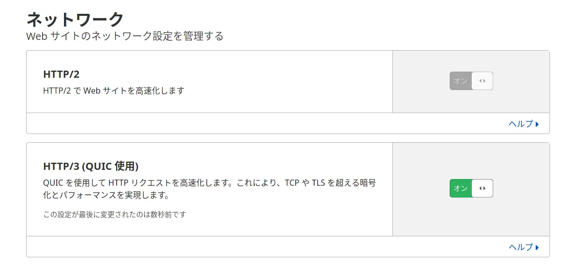 Cloudflare PagesはQUICに対応しているらしいので、ちょっと使ってみました。Cloudflareのコンパネの「ネットワーク」タブから、QUICを有効化します。