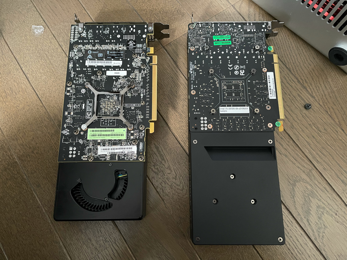 RX480のリファレンス(左)と今回のGTX1660Ti(右)のサイズ比較。基板だけならGTX1660Tiのほうが短いのにケース含めるとRX480のほうが短くなるという。