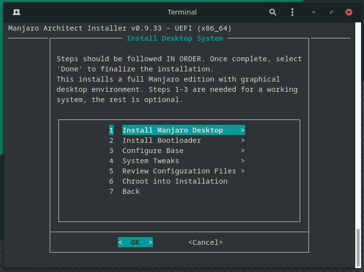 すでにパーティション設計とファイルシステム作成を終えているので、特別な設定が不要なら「Prepare Installation」をスキップして「Install Desktop System」から始められます。