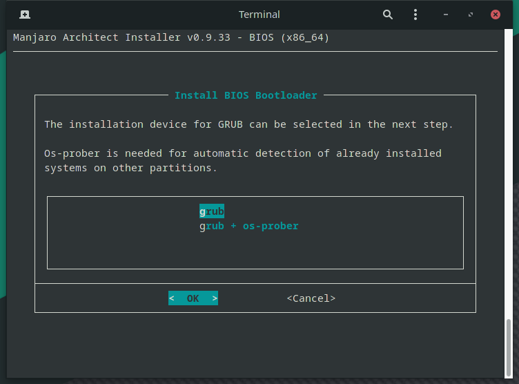 OSのインストールが終わったら「Install BIOS Bootloader」からブートローダーをインストール。私はsystemd-bootが好きなのでいつもsystemd-bootをインストールしています(画面は仮想環境上で実行しているためか、grubしか表示されていません)。
