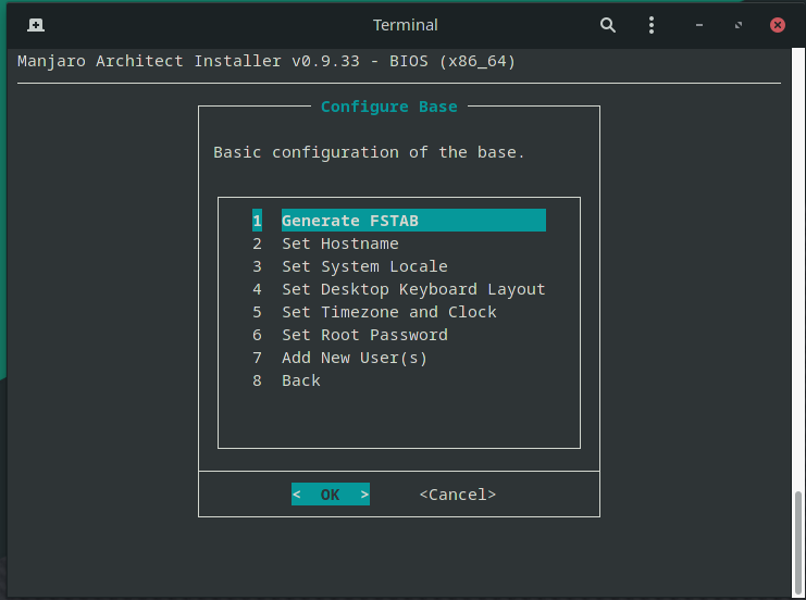 ブートローダーのインストールが終わったら「Configure Base」でホスト名やらロケールやらユーザーやらを設定。これでひととおりインストールは完了です。
