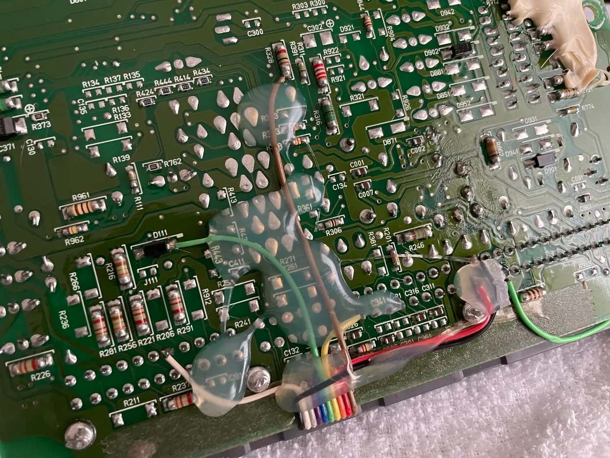 基板裏側も見てみましょう。なんかよくわからない場所をバイパスしているように見えます。