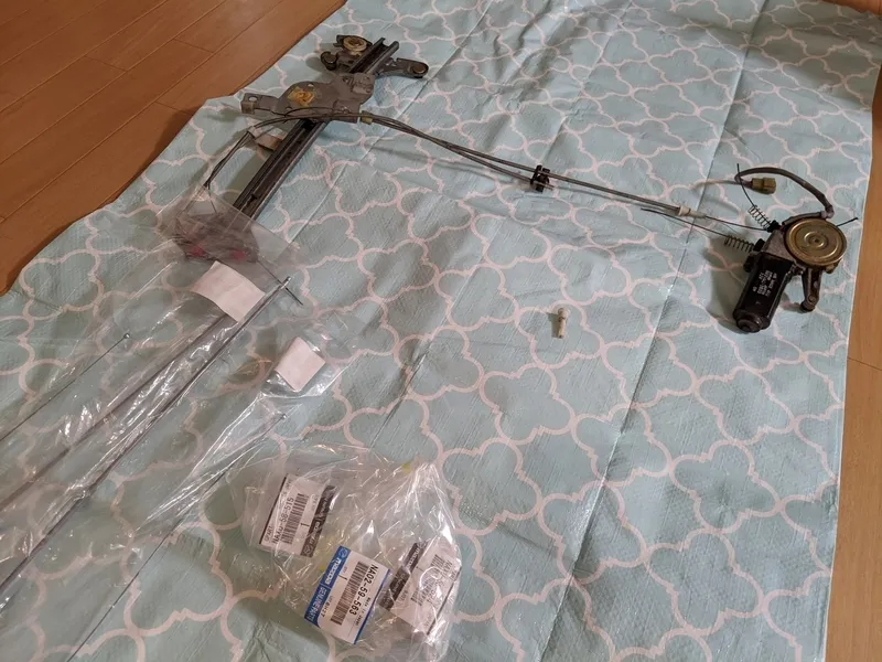 今回はレギュレーターやモーターなどは再利用、ワイヤーだけの交換を行うのでお安くできました。毎年メンテするところでもないので樹脂類は交換。