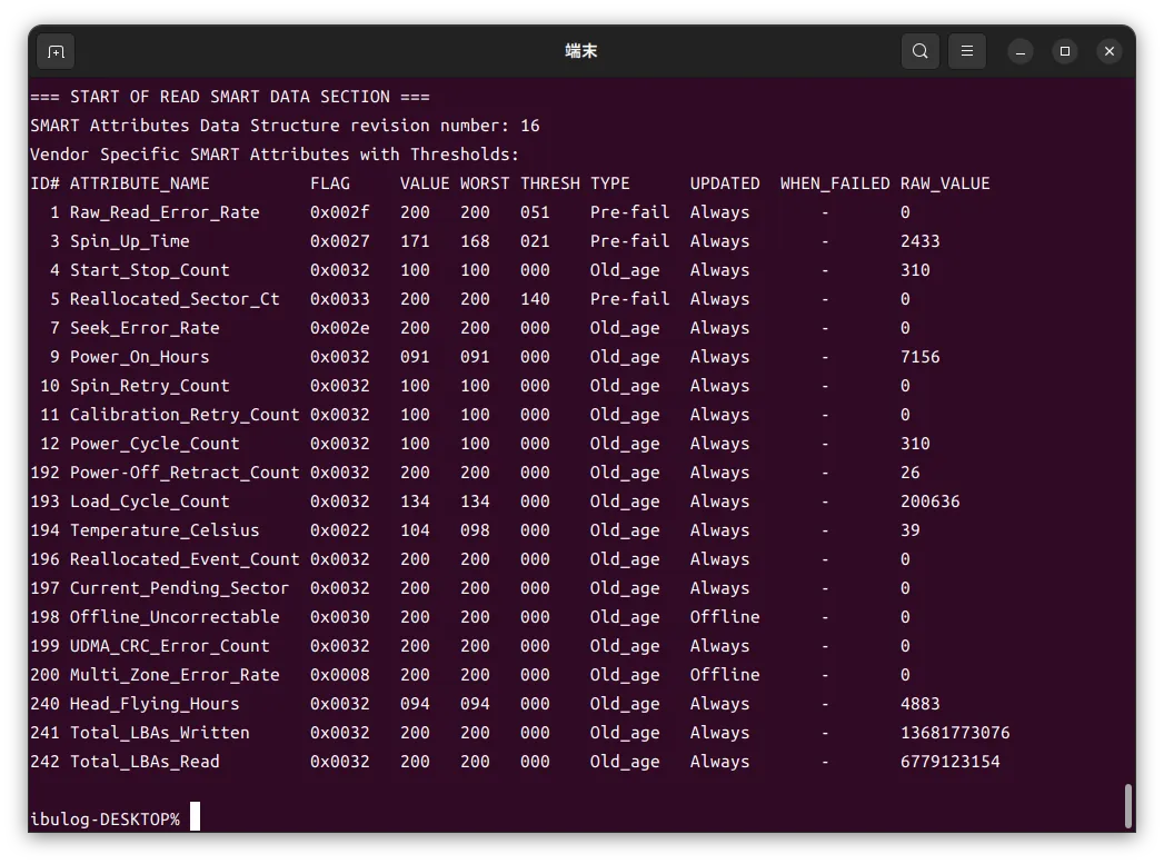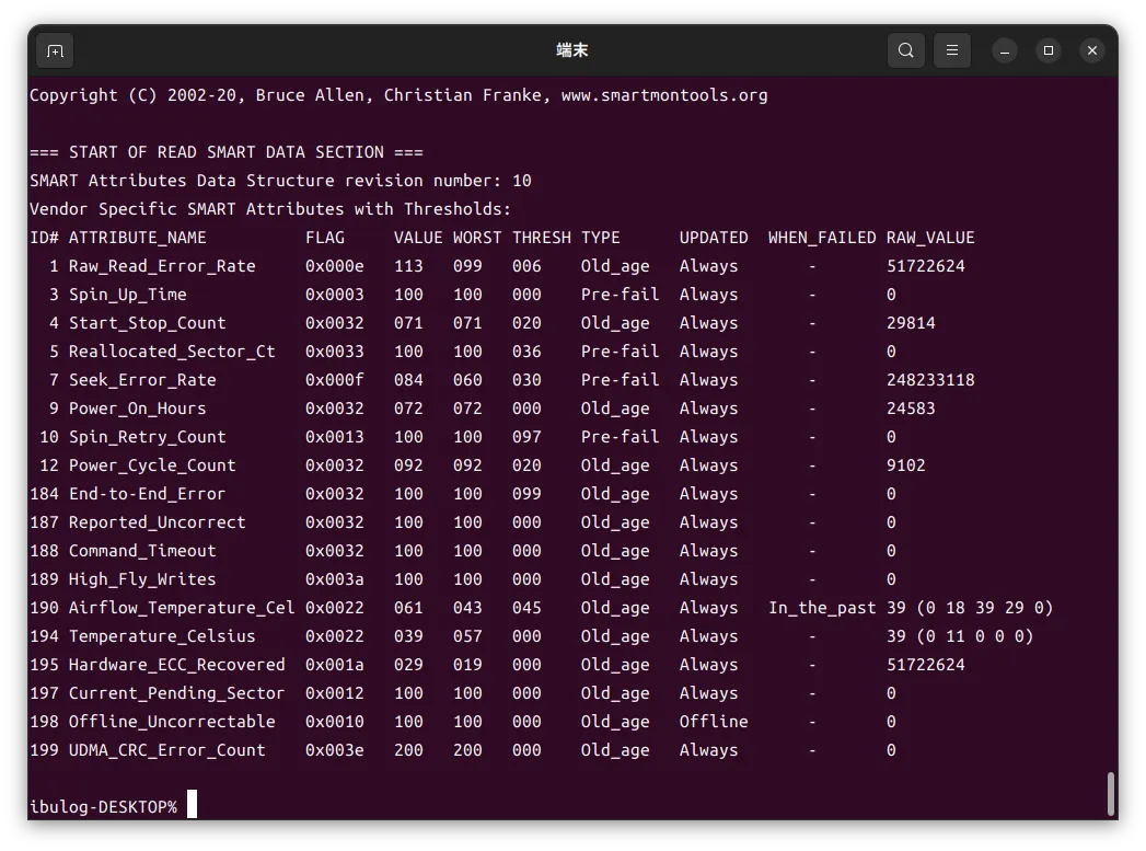 これが10年くらい使っているSeagate製HDDのS.M.A.R.T値です。