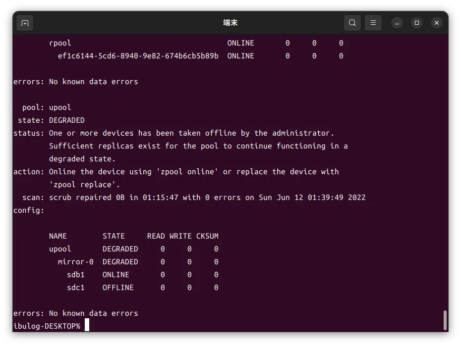 sudo zpool offline upool sdc1 sudo zpool offline upool sdc1 2. HDDを交換する