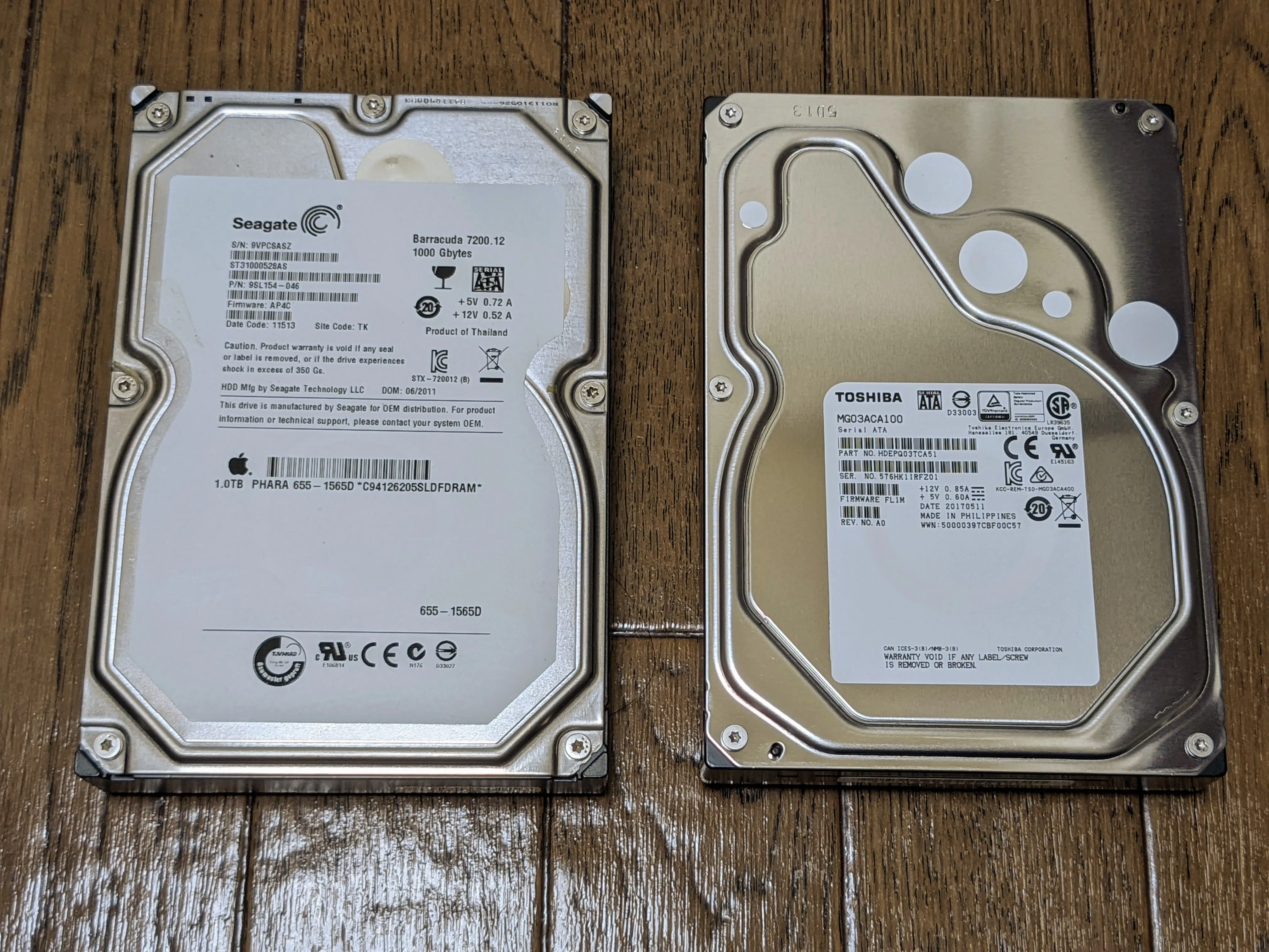 左が古いSeagate製HDD、右が新しい東芝製HDDです。