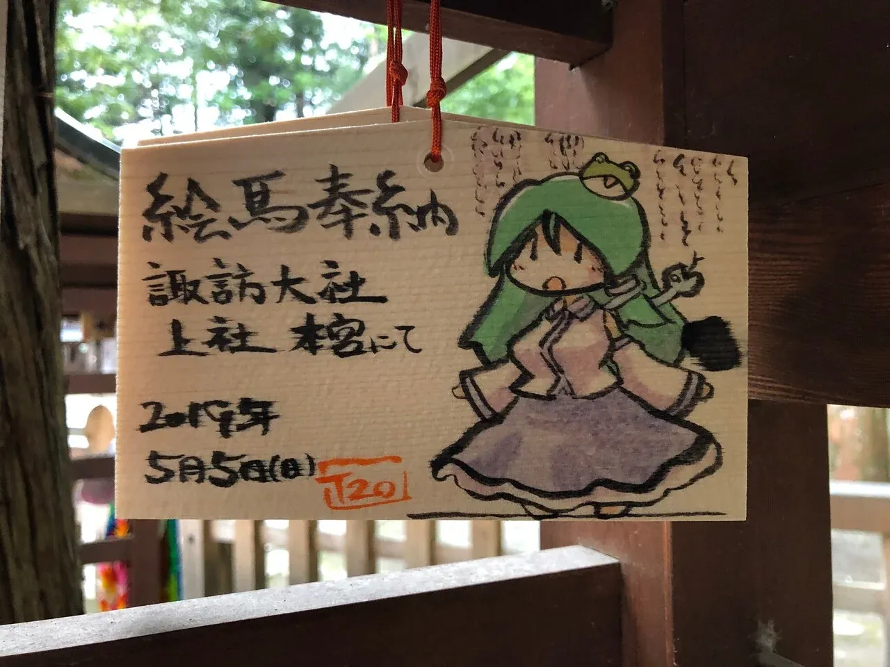 諏訪大社に行くと必ずチェックするのが、「T2O」という絵師さんの絵馬です。ゲーム「東方」のキャラクターの絵が描かれていて、かわいい!